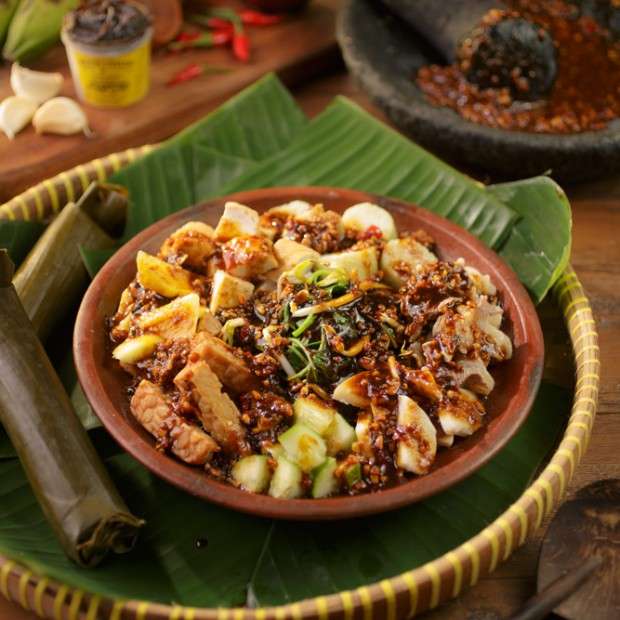 dengan tahu, tempe, lontong, lalu diguyur dengan bumbu petis yang dibuat dari petis